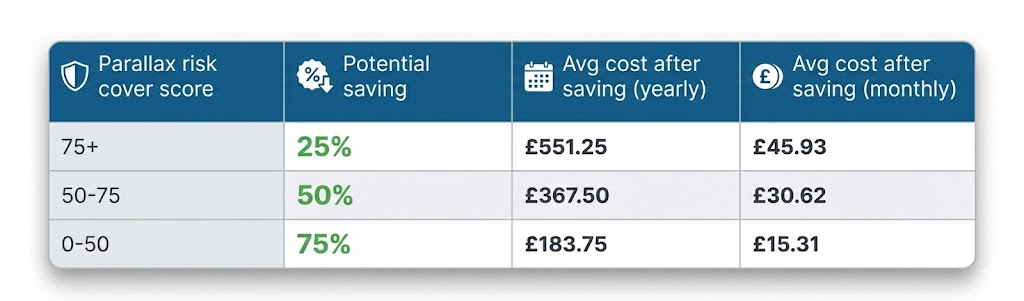 Assuming a perfect parallax score is 100 out of 100, and taking into account the current average cost of car insurance is £735* a year (or £61.25 a month) here’s the savings they predict you might get, based on your score: